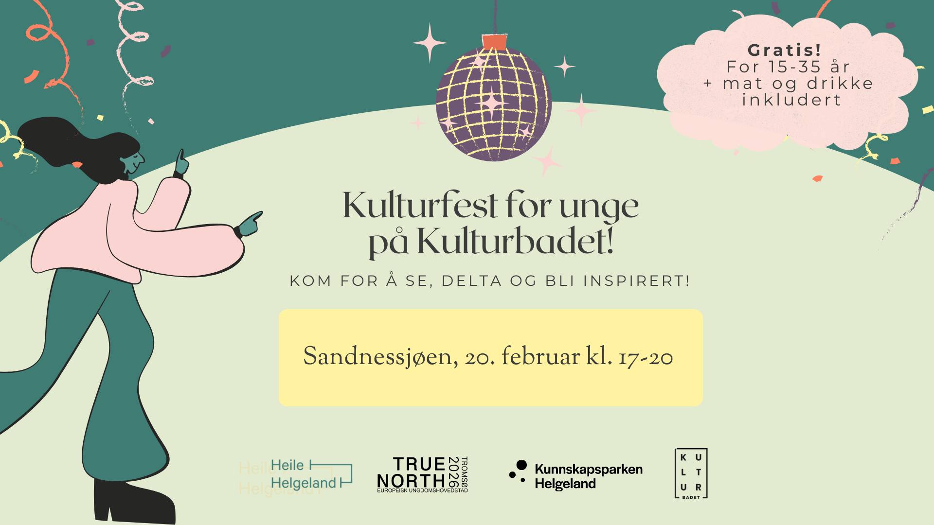 Velkommen til kulturkveld for unge omkring Sandnessjøen! Denne kvelden byr på musikk, dans, teater, åpen mic og en hyggelig møteplass for unge som er interessert i kultur 🫶🏼